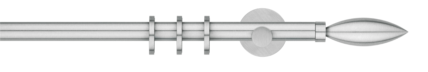 Karnisz pojedynczy, dostępny również w wersji podwójnej, w 10 różnych długościach: 120, 140, 160, 180, 200, 220, 250, 300, 340 i 400 cm. Produkt jest sprzedawany jako kompletny (wsporniki, kółka, śrubki do montażu).
